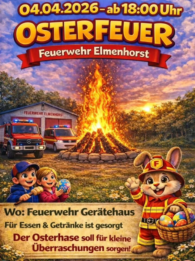 HervorgehobenGerätehaus Ortsfeuerwehr Elmenhorst Elmenhorst, GermanyOSTERFEUER am Gerätehaus der Ortsfeuerwehr Elmenhorst (Dorfstraße 1) am 04.04.2026 um 18 Uhr. Für Essen & Getränke ist gesorgt. Der Osterhase sorgt für eine kleine Überraschung.