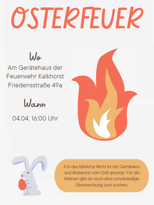 HervorgehobenGerätehaus Ortsfeuerwehr Kalkhorst Friedensstraße 49a, KalkhorstOSTERFEUER am Gerätehaus der Ortsfeuerwehr Kalkhorst (Friedensstraße 49a) am 04.04.26 um 16 Uhr. Für das leibliche Wohl ist mit Getränken und Bratwurst vom Grill gesorgt. Für die Kleinen gibt es noch eine schokoladige Überraschung zum suchen.